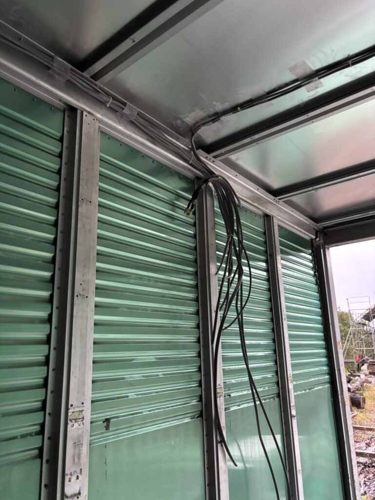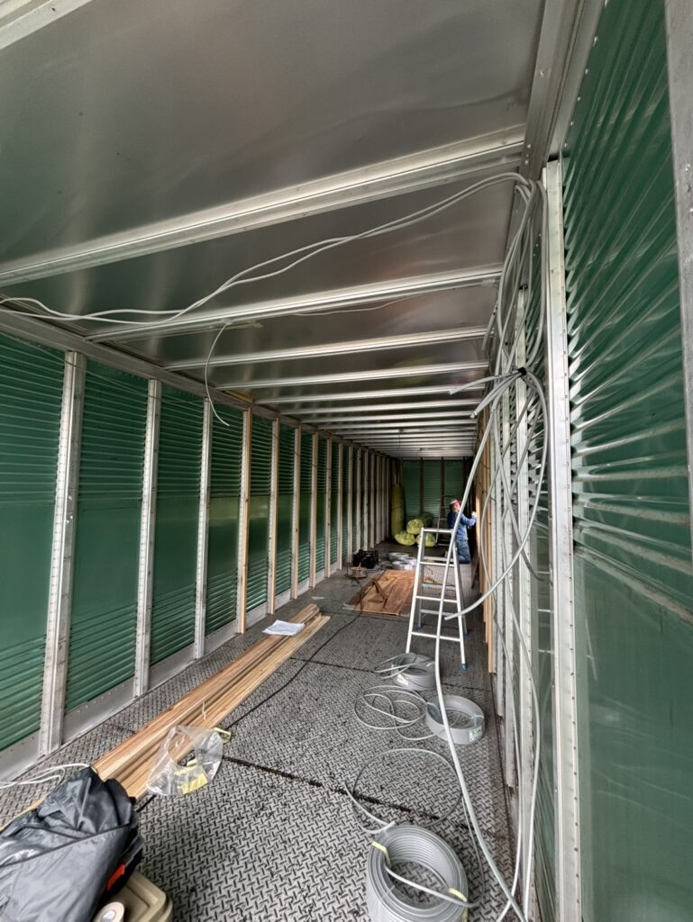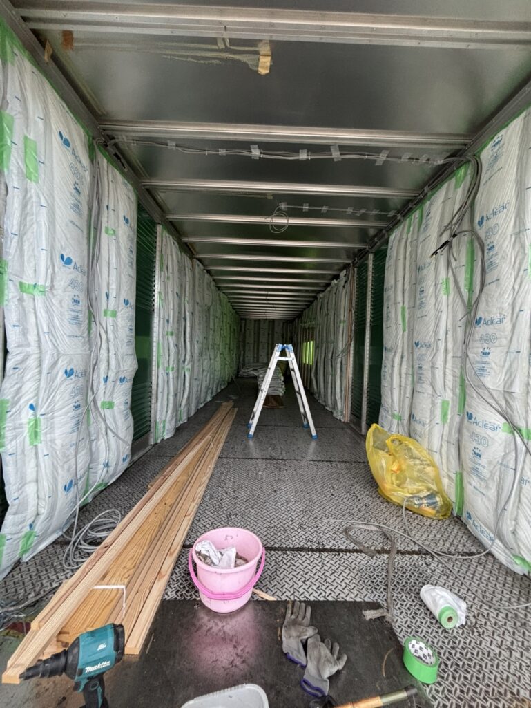 コンテナ内部解体、内装、外装塗装、電気工事全般、エアコン設置等。